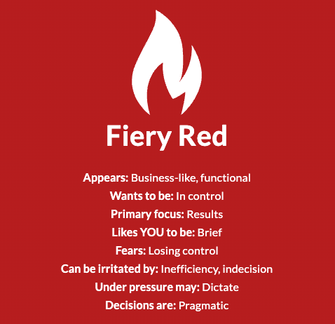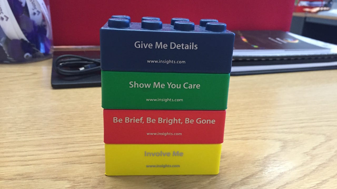 The output of this is a simplified, four color model that buckets what makes us unique, scoring how much of a “trait” we possess. From there, they give you 4 oversized lego blocks with each color + their description. They told us to put our highest scoring color at the top and lowest scoring color at the bottom so that team members could see these colors and know how to best engage with us.