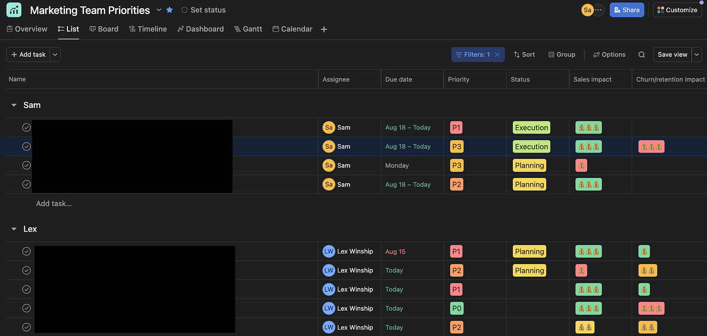 We don’t just list the tasks we’re working on + the timelines for them, but we also intentionally prioritize each item (P0 = drop everything and do this —> P3 = not urgent, but will make an impact), as well as assess each of these in relation to the impact they’ll make on net new sales and on churn/retention (💰💰💰 = significant impact, blank = no impact).