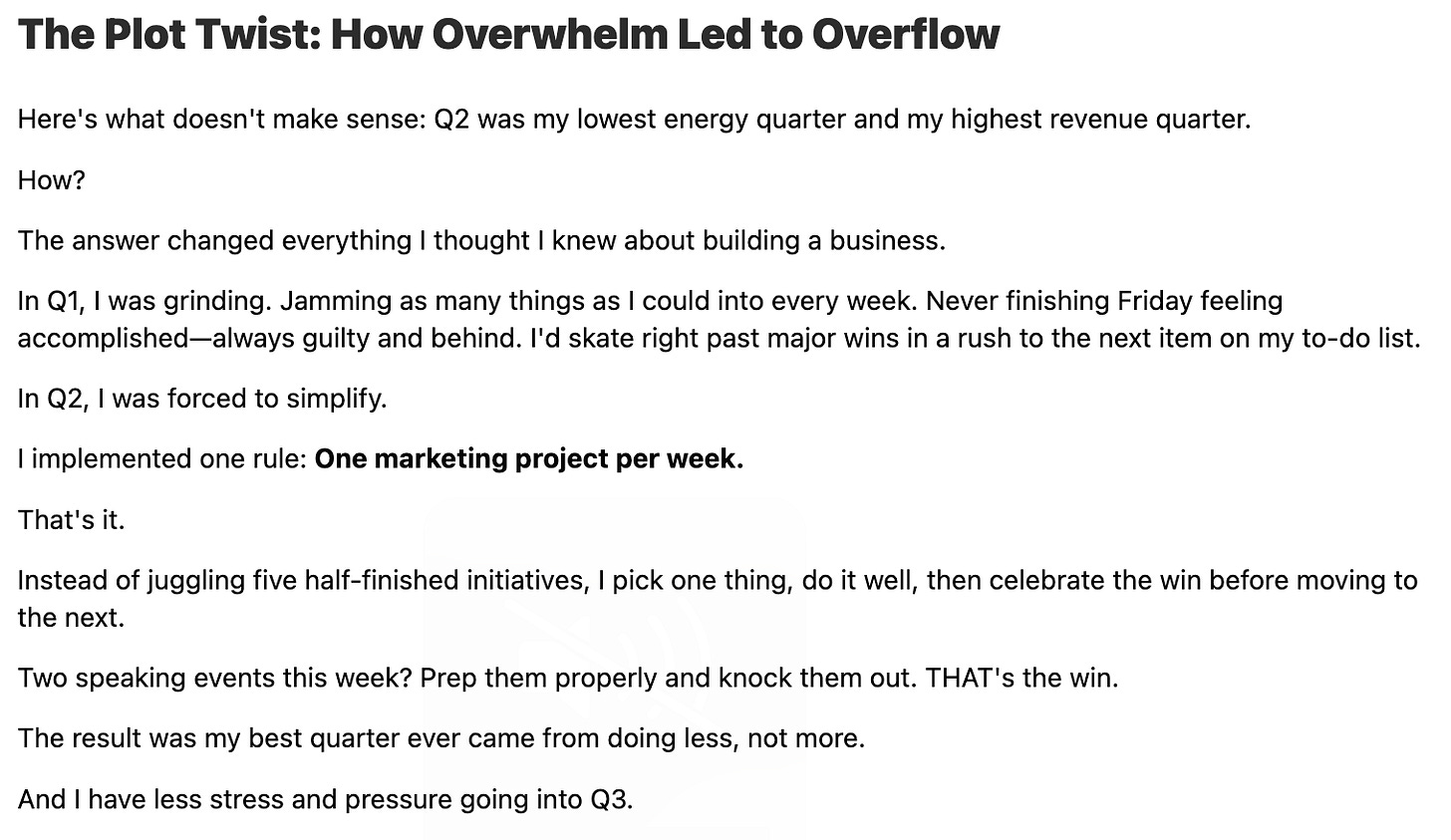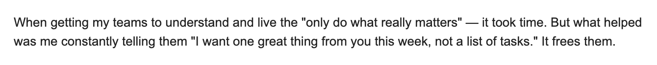 That last line of his, specifically, "I want one great thing from you this week, not a list of tasks,” is brilliant - simple and powerful. And I told him I was absolutely going to steal that and credit him with it, so this is me, stealing that last line for myself + for my team, but crediting Devin with it :)