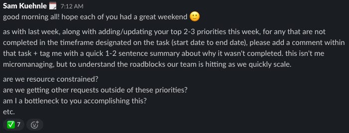 At the beginning of every week, I drop this note into our marketing team slack channel to have everyone add in what they’re going to be working on this week AND what was on the list last week that wasn’t accomplished. This is not to shame or guilt anyone for not accomplishing tasks, but to help us understand the why behind it not being completed so we can learn from that + apply that learning moving forward.