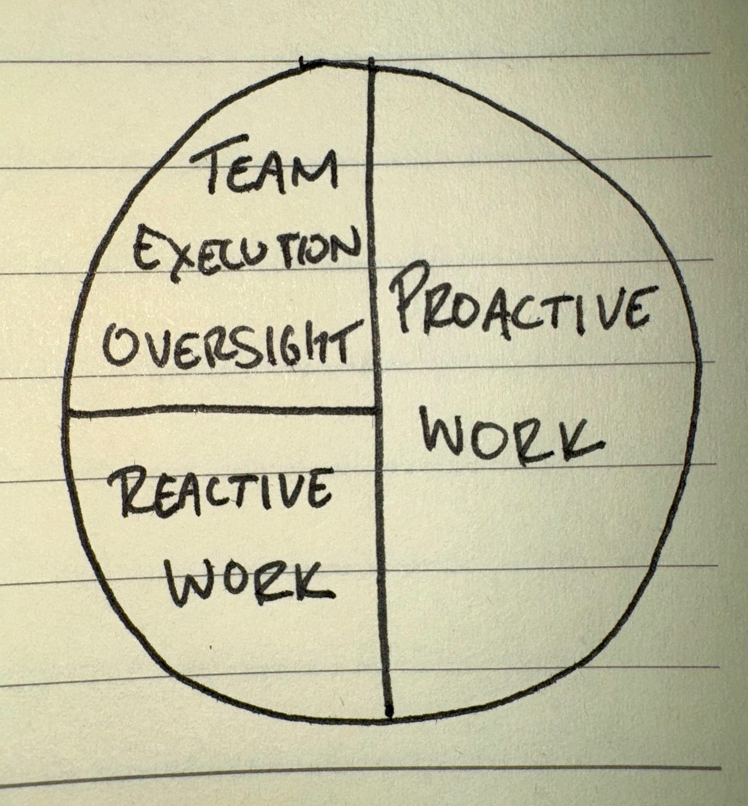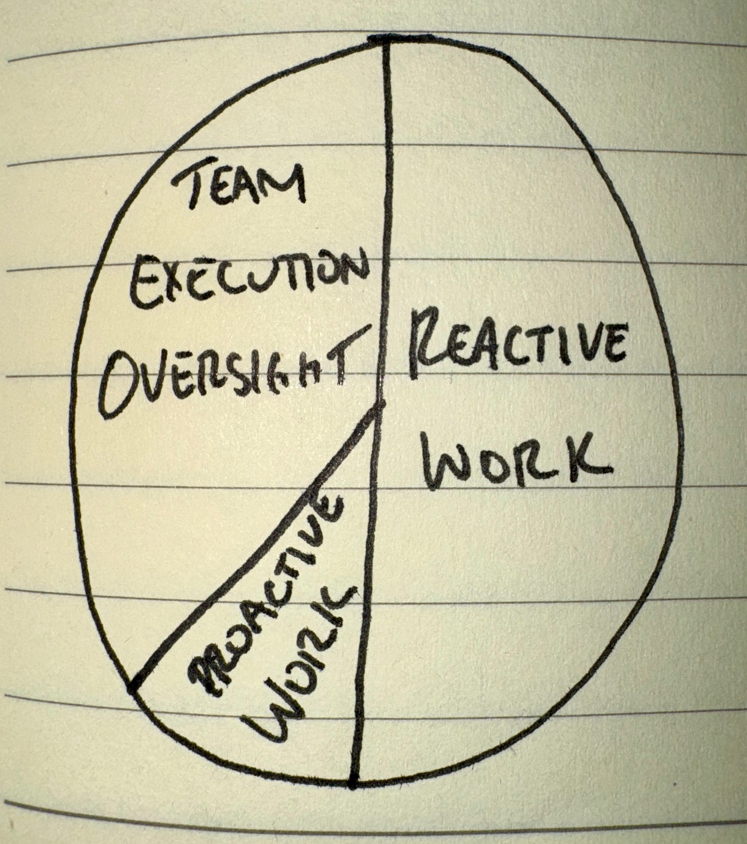 It’s no wonder I would feel productive, but wasn’t seeing meaningful progress forward - I was holding ground. 90% of my time was spent on reactive work or overseeing/helping my team with what they were working on.