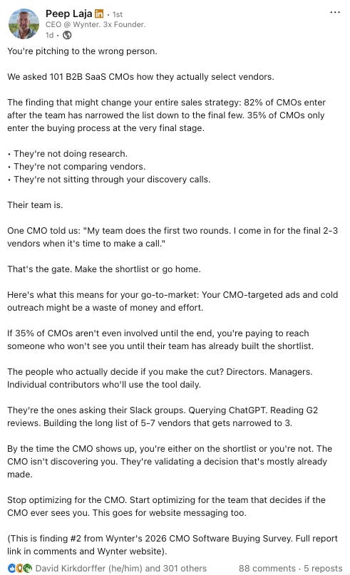 The execs aren’t doing the research or taking the discovery calls - they’re having their team do that. Or to pull from the post above, "My team does the first two rounds. I come in for the final 2-3 vendors when it's time to make a call."