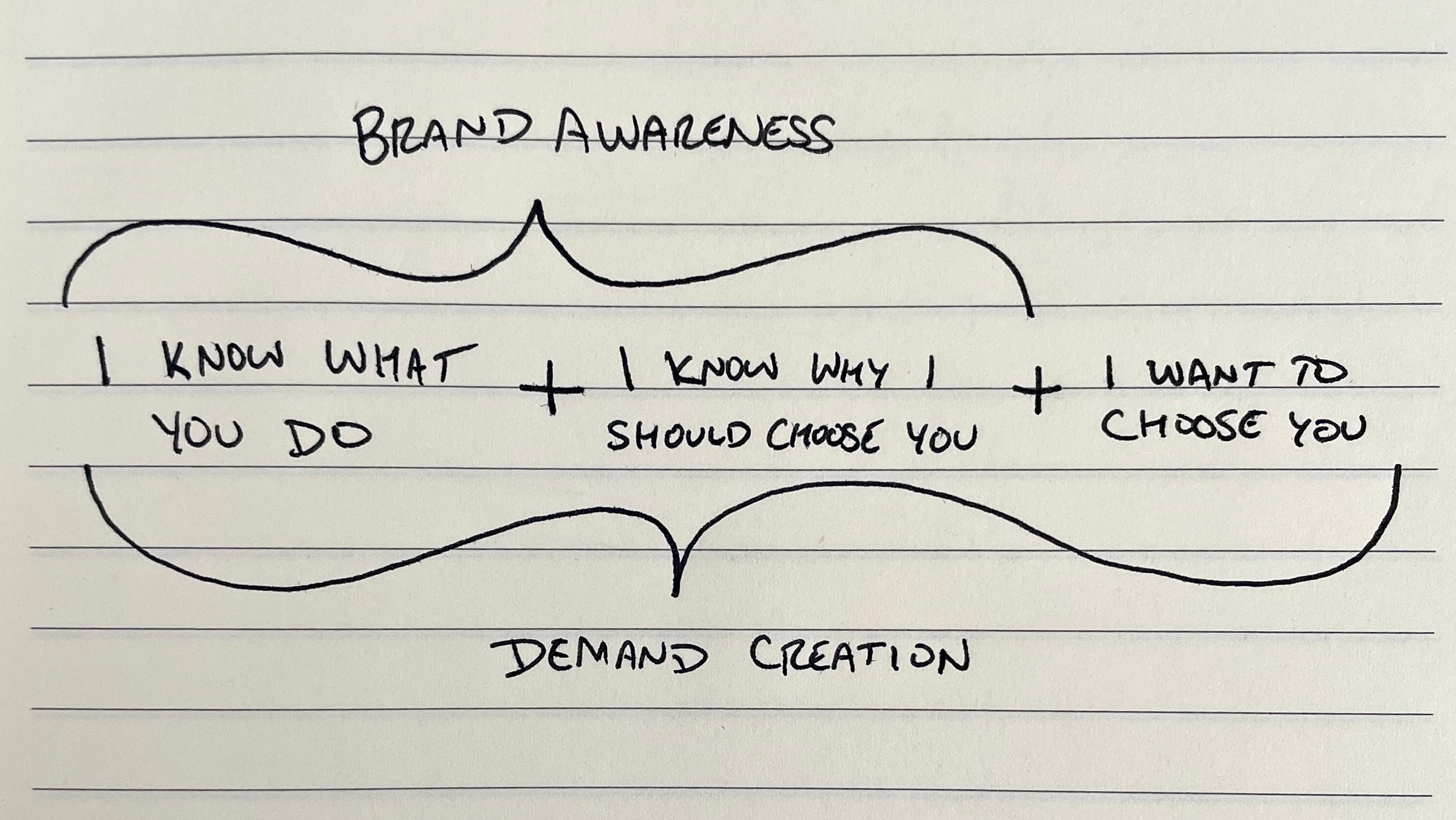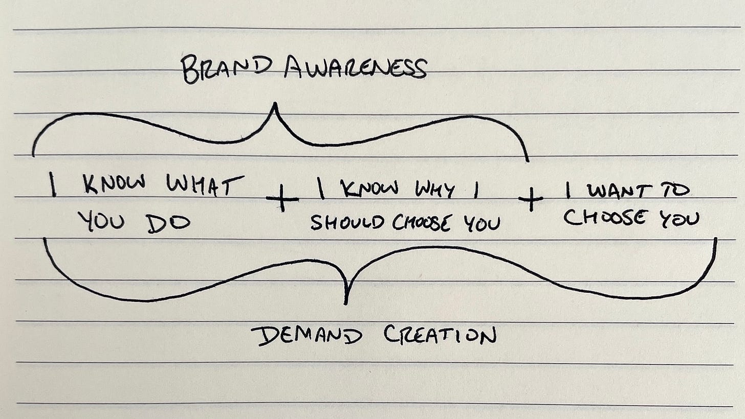This is why I can help you optimize your cost per demo down by 50%, but it still won’t matter if you don’t have a good brand/nobody wants to buy from you. And on the flip side, why having a strong brand makes mediocre demand gen tactics work better than they should. (This has always been one that drives great demand gen marketers crazy - “Our campaign is so much better than the market incumbent’s. Why aren’t we getting more demos???”)