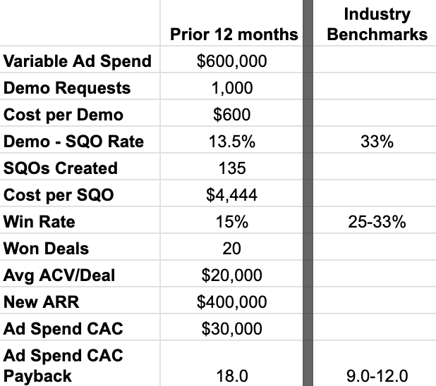 Cost per SQO (while cost per demo may be higher by not forcing prospects through the funnel, since they convert at significantly higher rates, that means you’re driving REAL pipeline at a much lower cost)